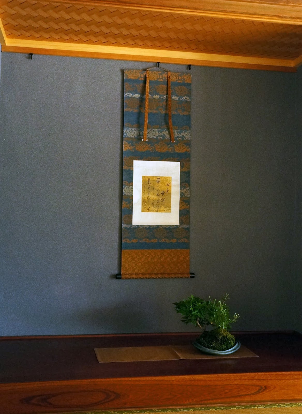 東京・八王子市にある高尾駒木野庭園の古民家で、表装造形家・石曽根和佳子(いしそねわかこ)さんの掛軸が飾られています。石曽根さんの作品に魅了されたYUKIMONO主催者のわたくしが、盆栽と一緒に飾ったら来訪者に喜ばれるのではと、同庭園の盆栽管理者である盆栽家・長沢孝二さんにご相談したことから始まりました。